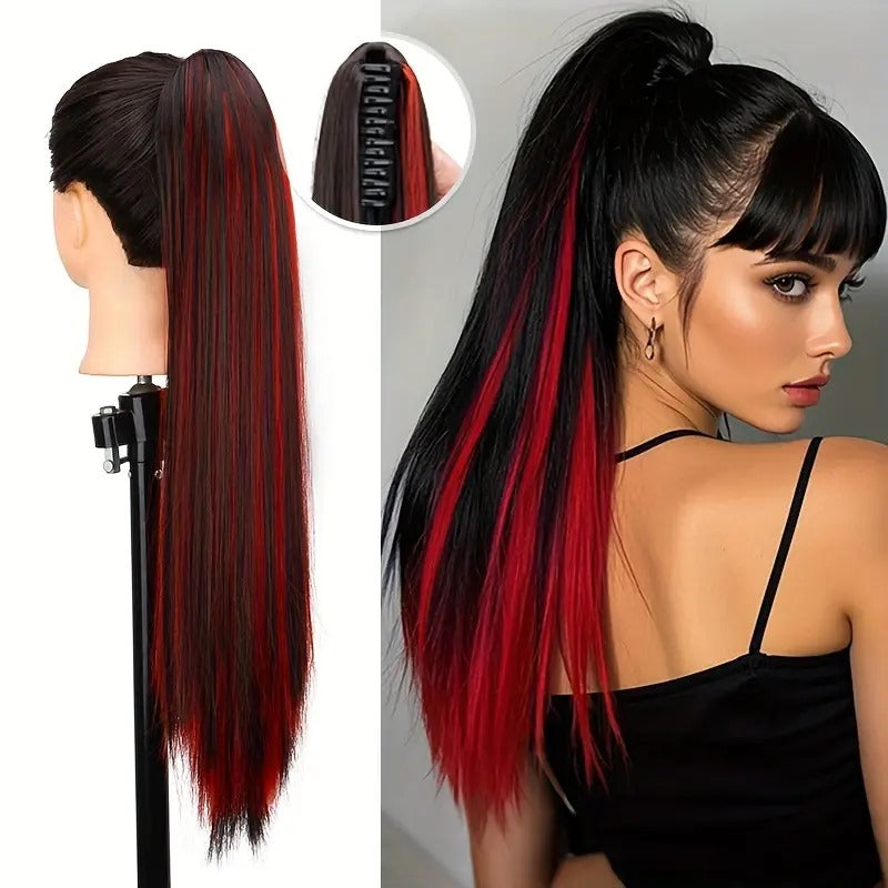 Vibrant Clip-On Synthetic Ponytail Hair Extensions - Straight Highlights in Red, Pre-Bleached for Everyday & Party Wear, Easy to Use Hair Accessory for Women, Hair Accessories.