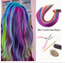 Mixed colors 16 inch50.8 cm 50 strand set of synthetic color I-shaped hair extensions (tools include: 1 mixed colored hair extension pliers, 1 crochet hook, 100hair extension ring), suitable for Women's high-temperature fiber wig accessories.