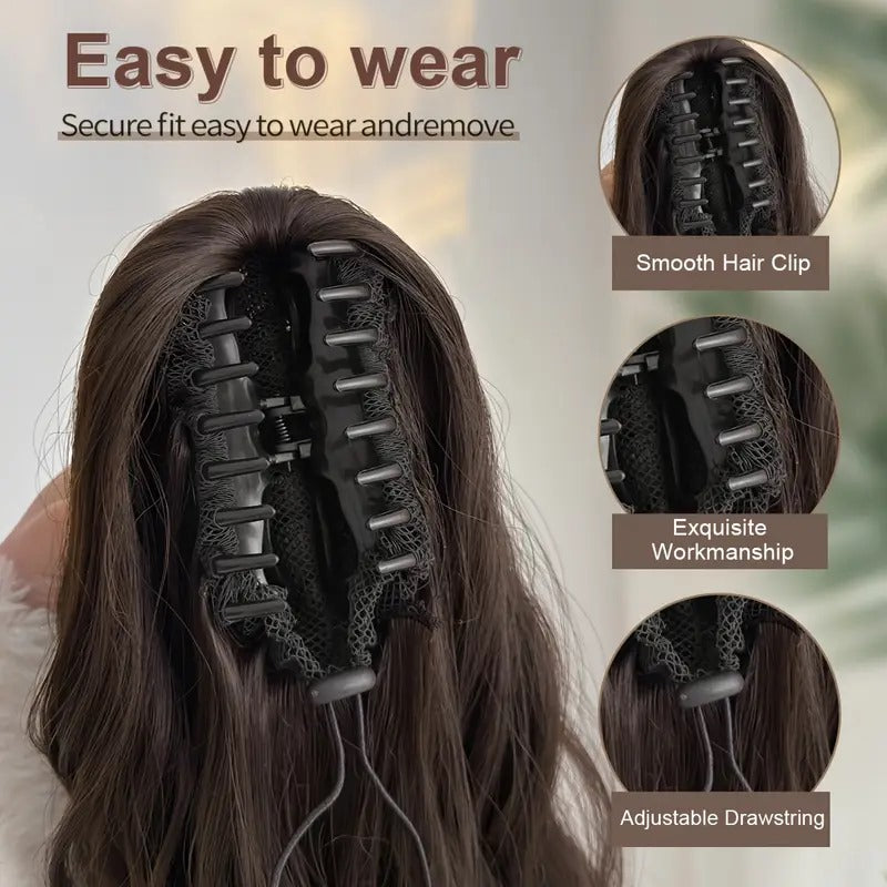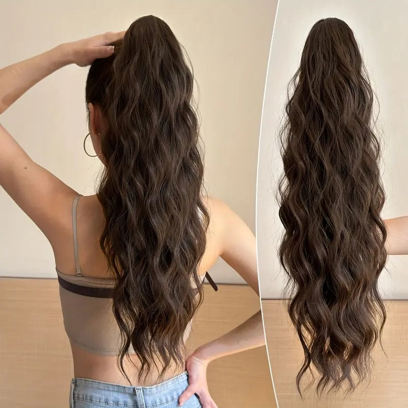 Synthetic Ponytail Wig Designed for Women to Enhance Hair Volume And Delay Hairstyle Changes. Suitable for Everyday Wear Or Party Outfits to Boost Feminine Charm. Dark Brown, Featuring a Large Wavy Ponytail Style.