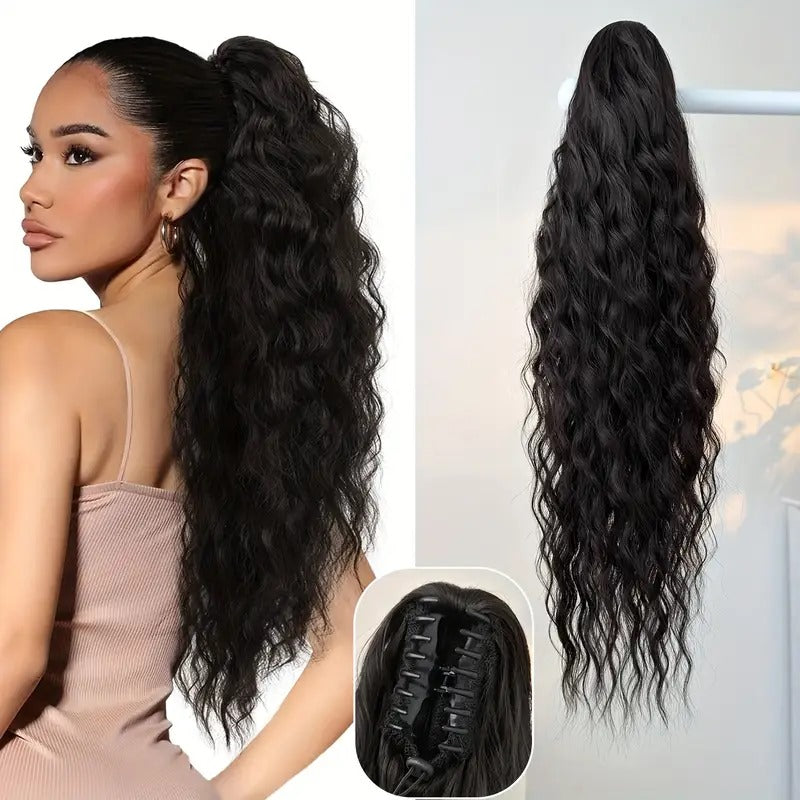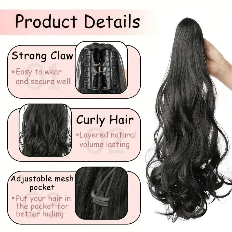 Fluffy Curly Wave Clip-In Ponytail Extensions - Multi-Layered Soft Synthetic Hairpiece with Claw Clips, All Ethnicities - Adds Volume & Length for Parties, Weddings, Photoshoots, Hair Styling Accessories, Photoshoot Hairpiece, Secure Claw Attachment, Party Hairstyles, Cosplay Hairpiece.