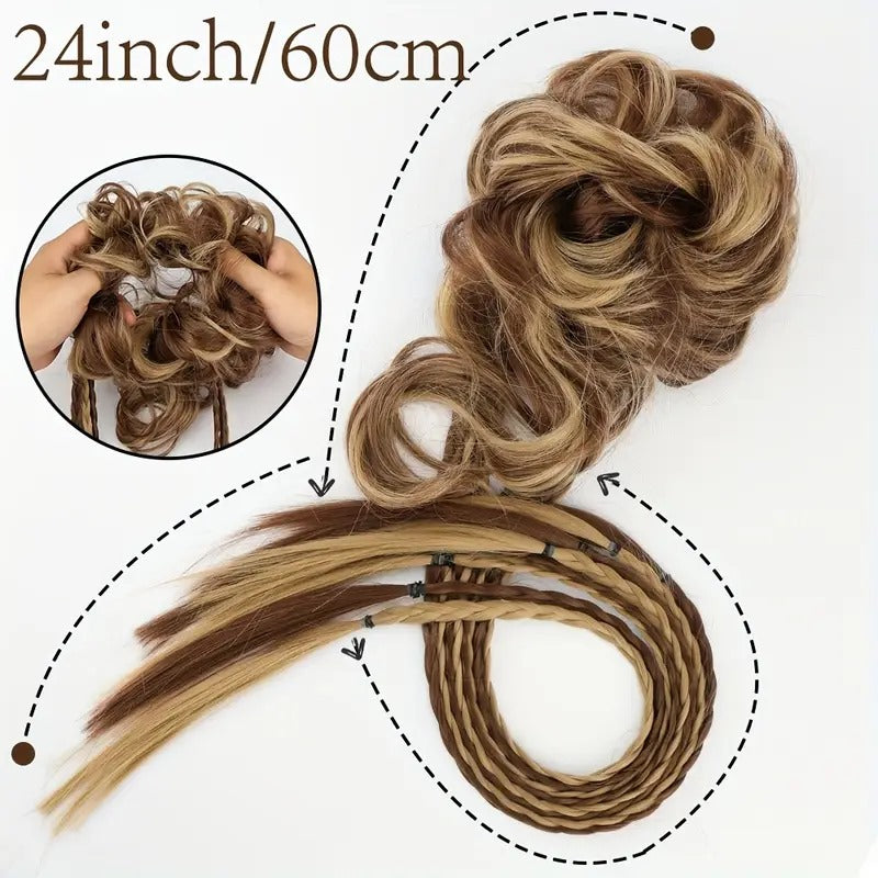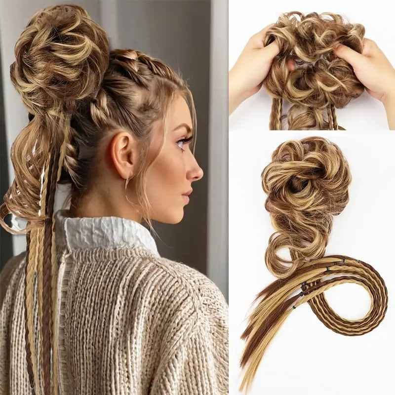 Brown Hair Bun Braid Wig, Synthetic Ponytail Extension for Women's Hairstyle with Volume Boosting Ponytail and Braided Pigtails.