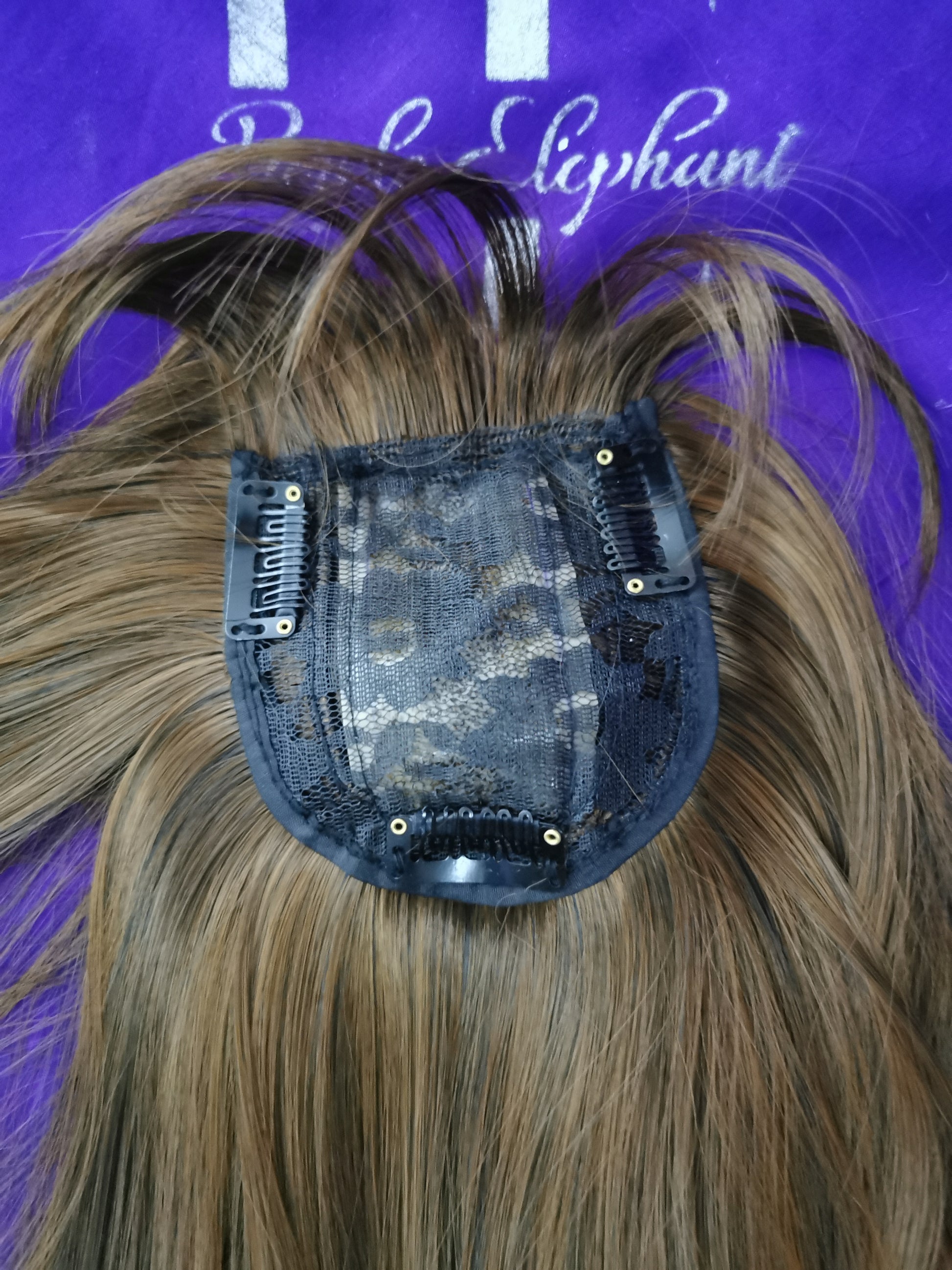 Brown - Hair topper designed to conceal hair loss or thinning in specific areas of the scalp, clips to your existing hair to add volume and coverage, offering a less-intrusive alternative to a full wig. Heat-friendly synthetic hair affordable option that holds its style well, even after washing. Heat-friendly varieties can be styled with low heat settings. Hair toppers use pressure-sensitive clips to attach securely to your existing hair.