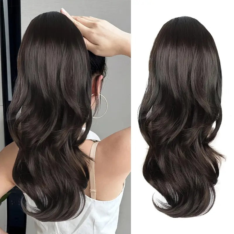 Elegant 26-Inch Natural Dark Brown Body Wave Ponytail Extension - Long, Layered Clip-In Synthetic Hairpiece for Women.