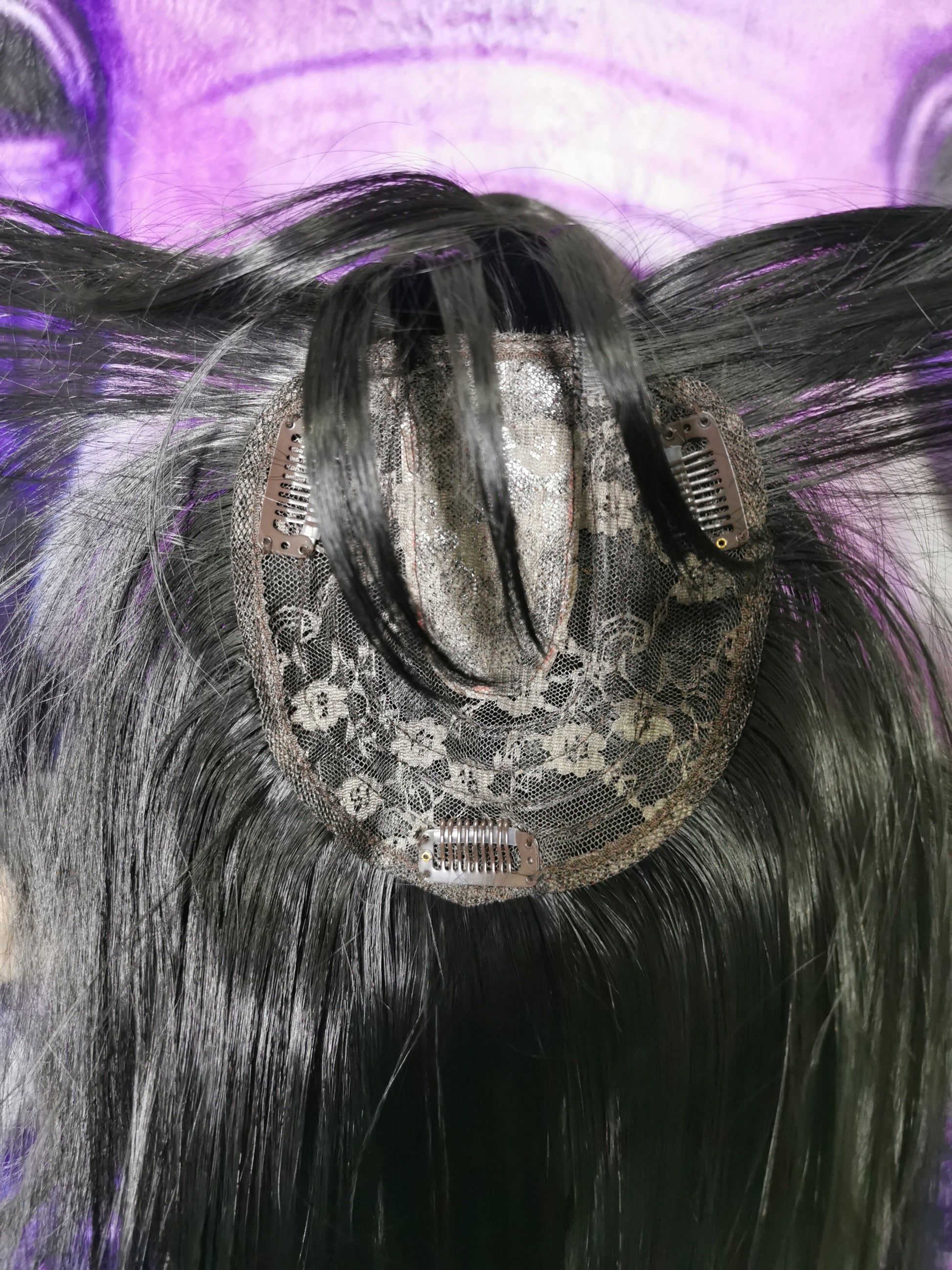 Black - Hair topper designed to conceal hair loss or thinning in specific areas of the scalp, clips to your existing hair to add volume and coverage, offering a less-intrusive alternative to a full wig. Heat-friendly synthetic hair affordable option that holds its style well, even after washing. Heat-friendly varieties can be styled with low heat settings. Hair toppers use pressure-sensitive clips to attach securely to your existing hair.