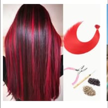 Red 50.8 cm 50 strand set of synthetic color I-shaped hair extensions (tools include: 1 red hair extension pliers, 1 crochet hook, 100hair extension ring), suitable for Women's high-temperature fiber wig accessories.