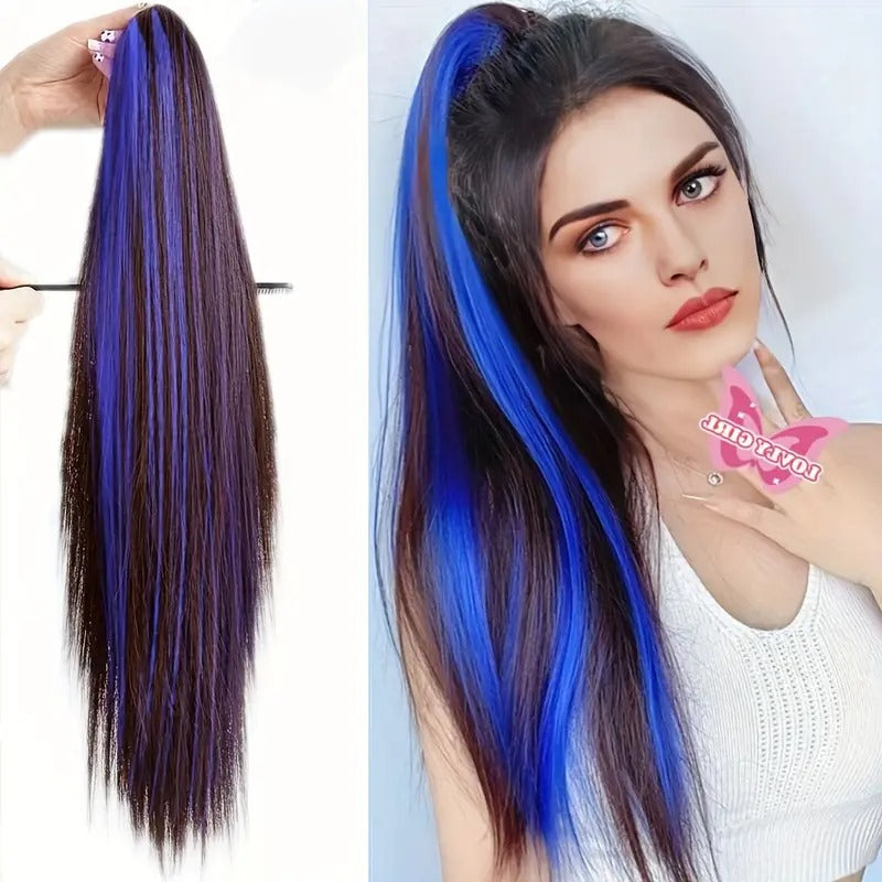 45.72 cm Women's Claw Clip Ponytail Hair Extensions brown Hair with Blue Highlights Ponytail Hair Extensions Straight Synthetic Ponytail Clip Ponytail Hair Extensions.
