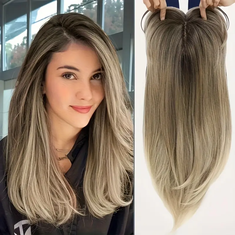 An elegant ombre blond top wig designed for individuals with thinning hair, featuring three secure clips to prevent slipping. It’s an excellent gift for mothers and is convenient for daily wear during outings. Made of khaki synthetic material