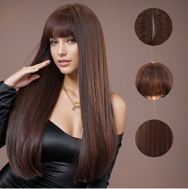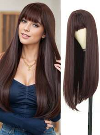 [Heat Resistant Synthetic Wig] Dark Brown Heat Resistant Long Straight Synthetic Wig With Bangs For Women - Ideal For Cosplay, Parties & Daily Use, Wig Accessories