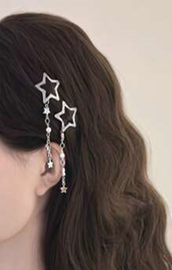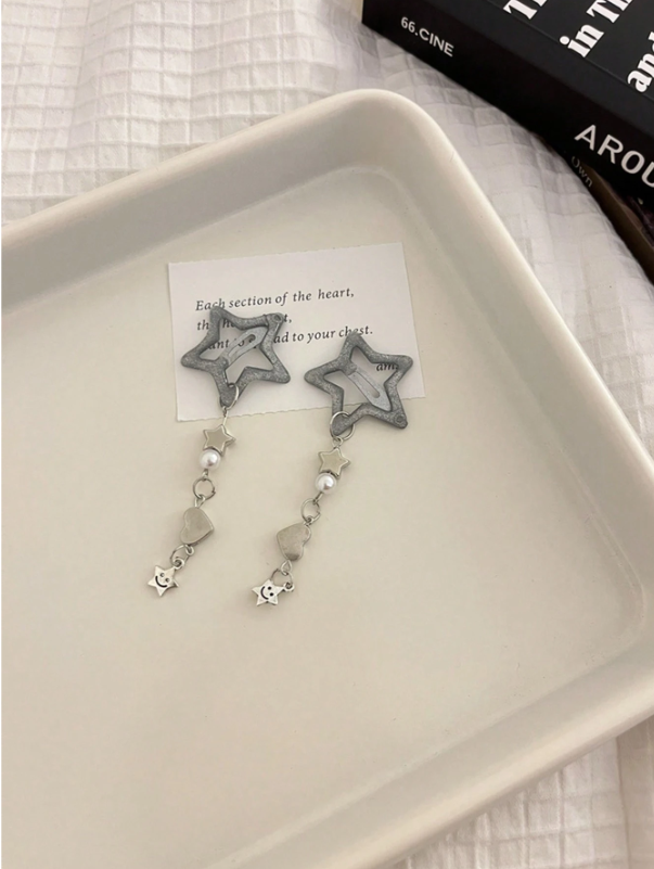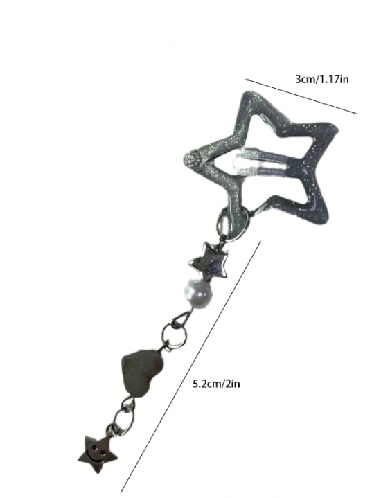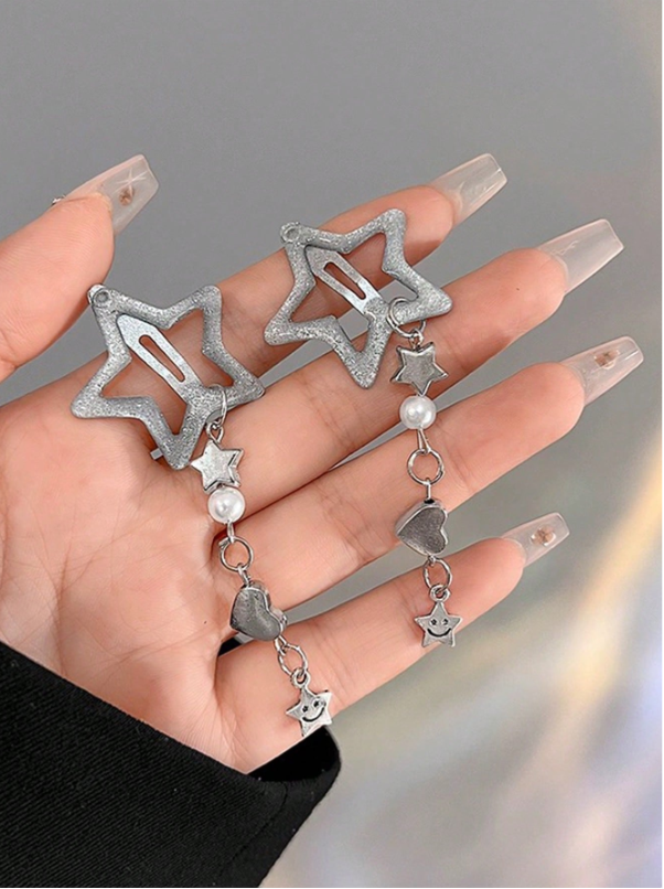 2pcs Silver Star Shaped Tassel Hair Clip With Chain & Side Hair Pin , Claw Clips Hair Claws Hair Barrettes, School Stuff