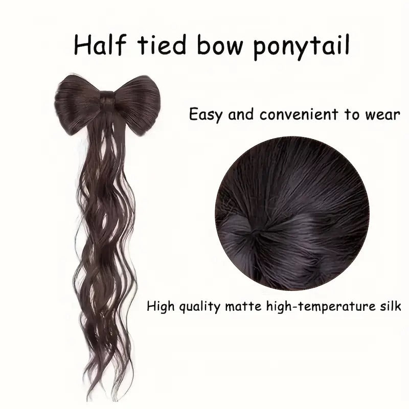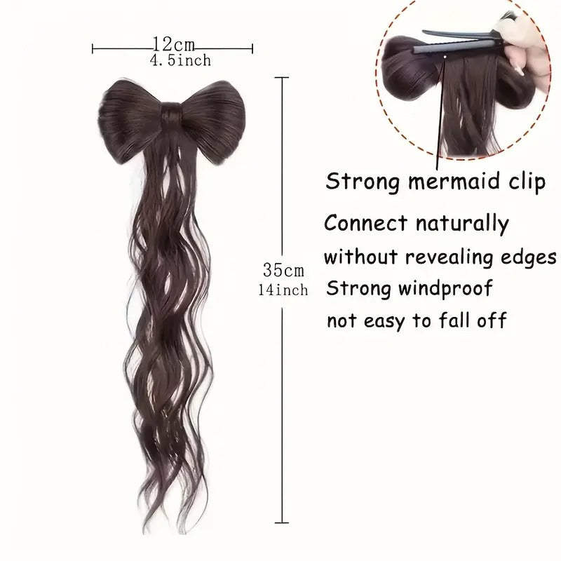 35.56cm / Brown Black - 14-Inch Protein Filament Bow Ponytail Extension for Women - Elegant Half-Tied High Ponytail with Chicken Feather Curls, Claw Clip Bun, and Vintage Style Braided Hair.