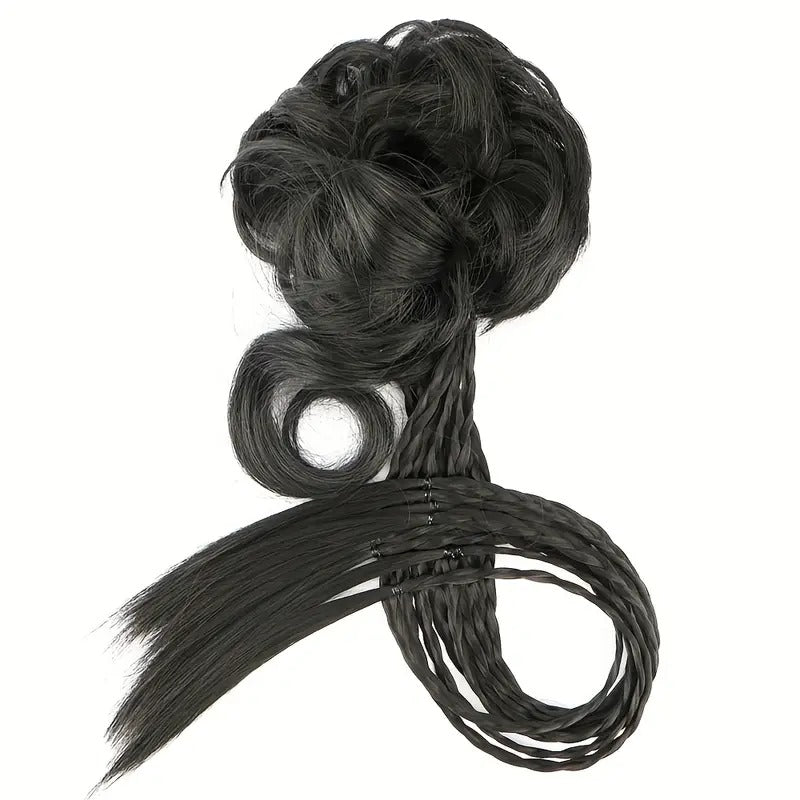 60.96cm / Black Hair Bun Braid Wig, Synthetic Ponytail Extension for Women's Hairstyle with Volume Boosting Ponytail and Braided Pigtails.