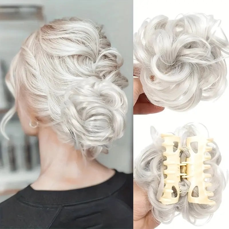 Women's Voluminous Curly Bun Wig - Easy Clip-In Updo Hairpiece with Messy Texture, Gray, Synthetic Fiber Wig for Parties, Photoshoots, Everyday - No Maintenance Required, Wig Accessories, Photoshoot Hairpiece, Fluffy Curly Texture, Quick Hairstyle, Natural looking Hair, Busy Professionals.